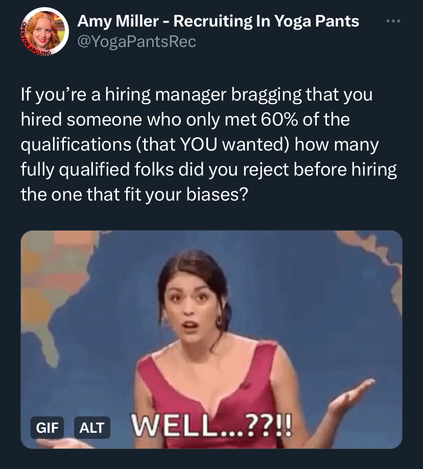 If you're a recruiter or hiring leader serious about increasing representation of under represented employees, let's chat. Getting serious about what is ACTUALLY required and staying true to a fair and compliant process will get you there. Otherwise you're at MAJOR risk of "going with your gut" - which doesn't always work out for the very people you claim to care about. 🤷♀️